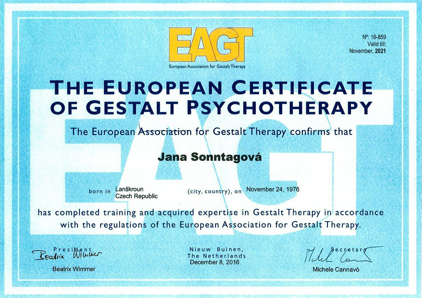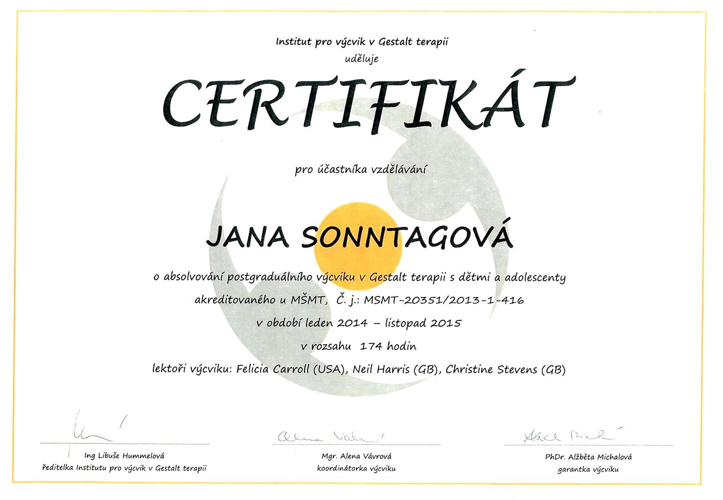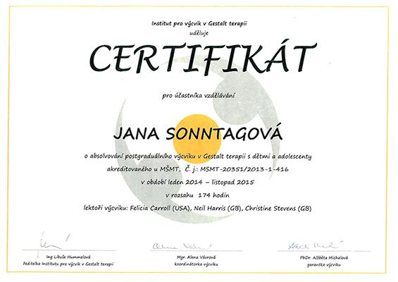 - 2014-2015 Postgraduální výcvik v Gestalt terapii s dětmi, dospívajícími a jejich rodinami